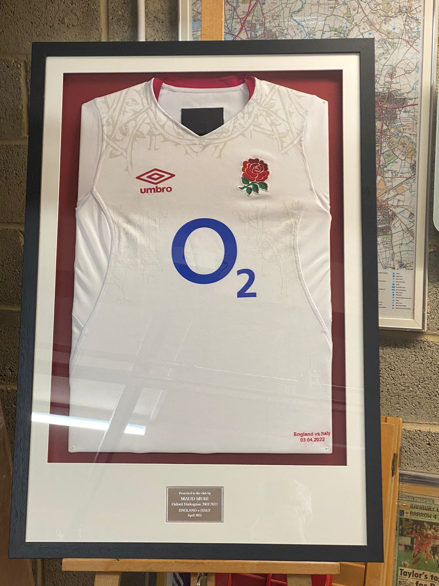 An original Oxford Harlequins RFU shirt, framed for hanging in their clubhouse