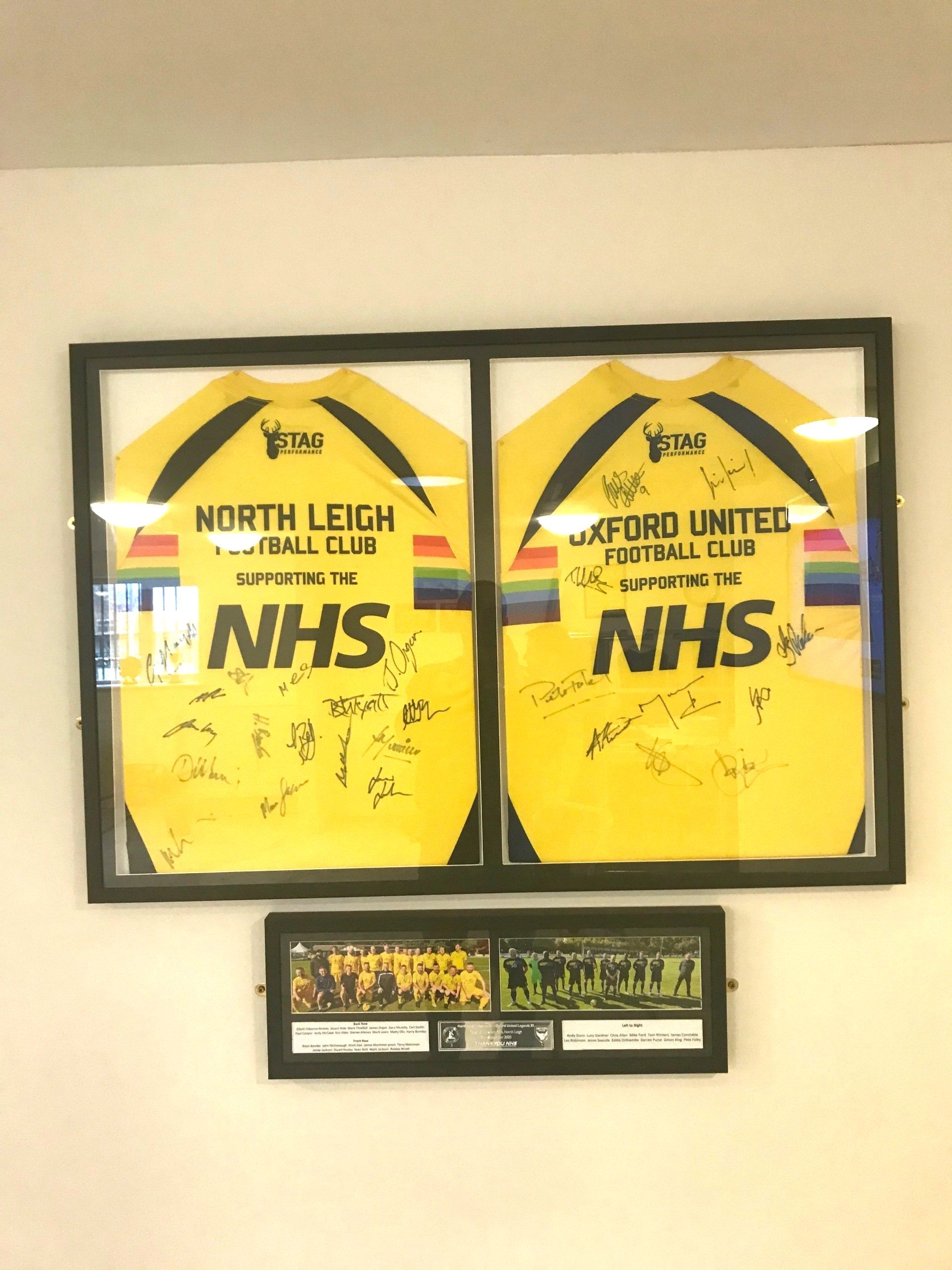 Signed North Leigh FC and Oxford United FC shirts made available for framing after the North Leigh Legends X1 -v- Oxford United Legends X1 NHS Charity Match which took place on Sunday 27th September at Eynsham Park. Double frame now hanging in the North Leigh FC clubroom.
