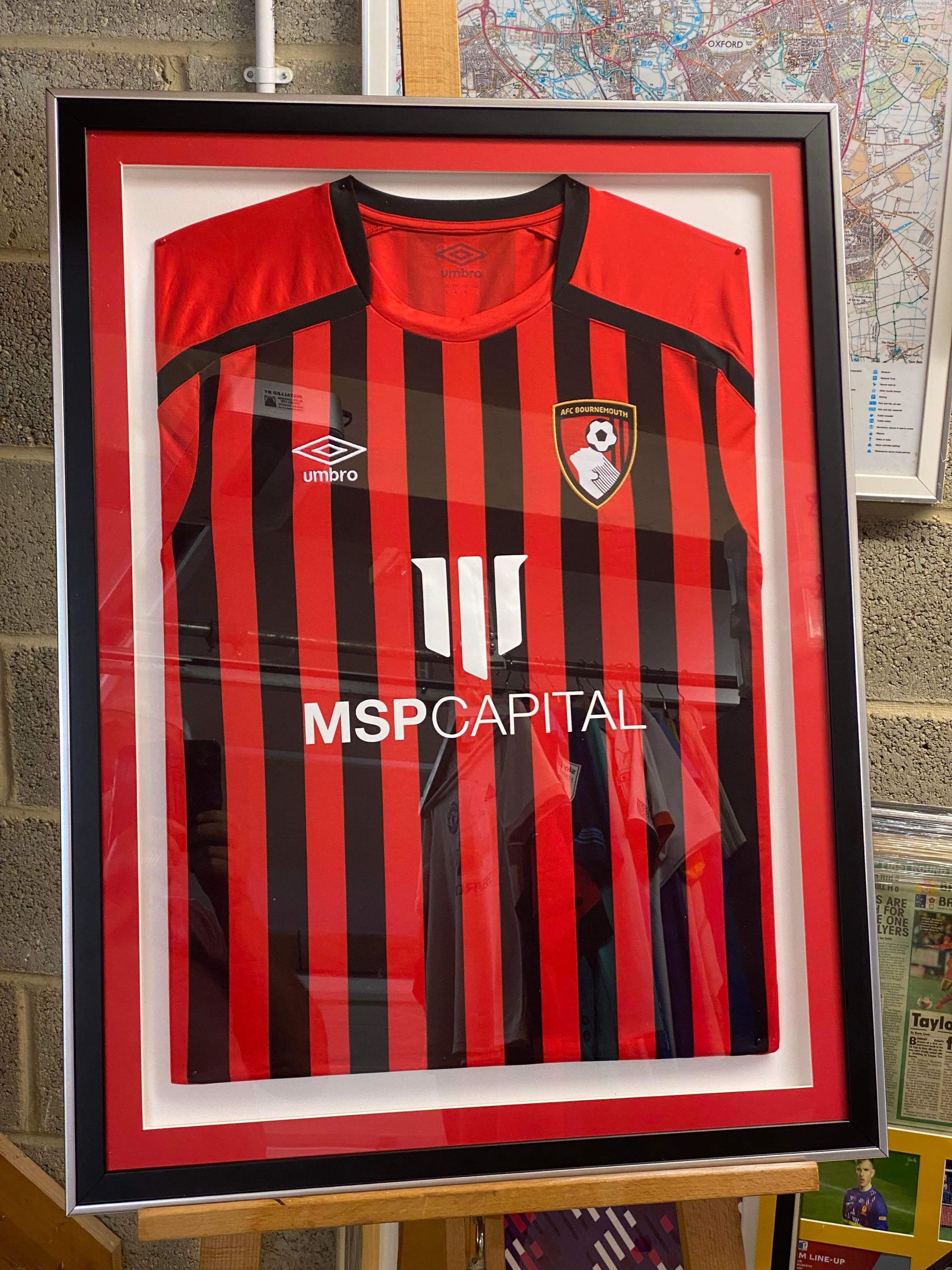 A signed Eddie Howe AFC Bournemouth shirt presented to Dave Mott of Physio Fitness by Eddie Howe for all his hard work at the football club. Thank you for letting me loose on the framing Dave !!!