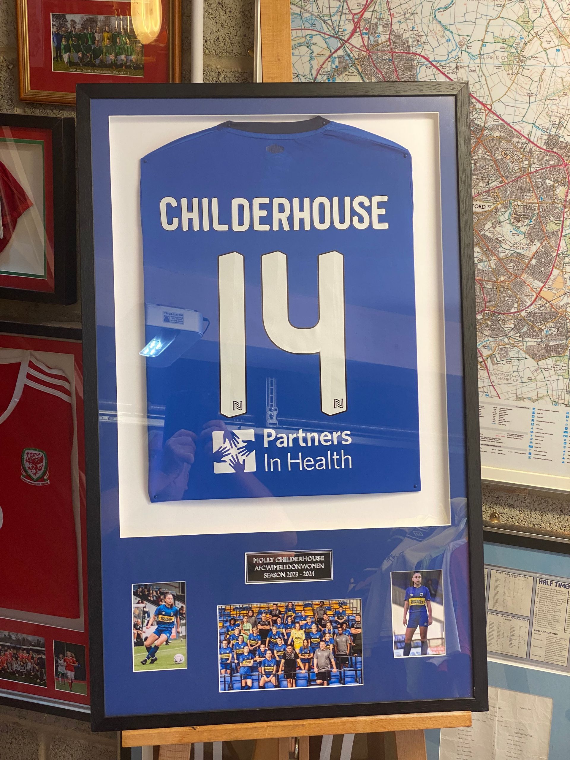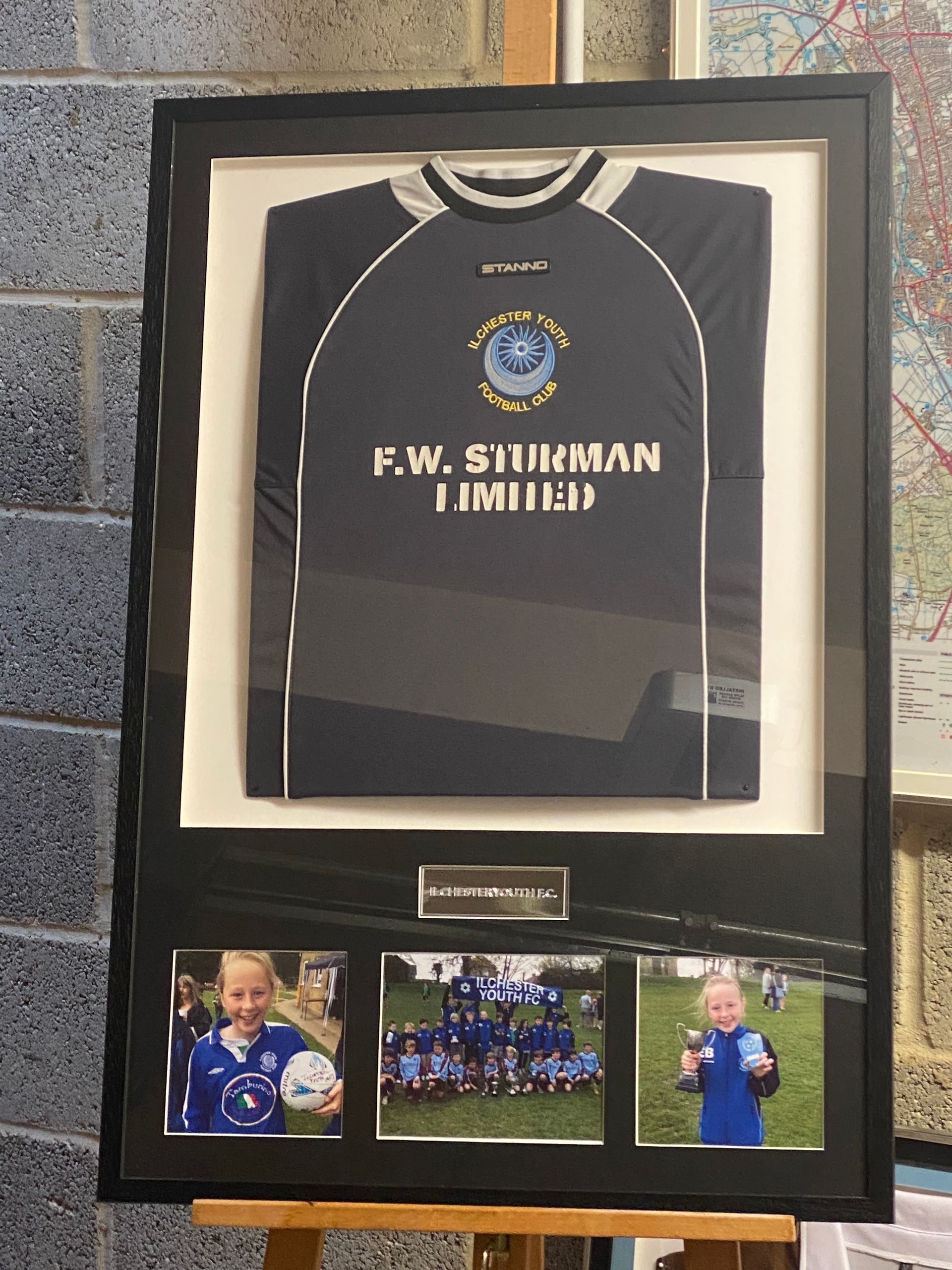 Four shirts framed (Pen Mill Girls U16, Ilminster Town, Yeovil Town Ladies FC, and Southampton Women FC), complete with photographs, all representing the footballing career to date of Erin Bloomfield, and now all hanging proudly in her dad Rays' office as his reminder, as she follows her dream of playing in the US at Troy University from this summer