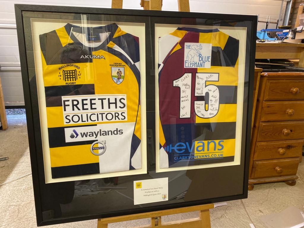 Thank you to Oxford Harlequins RFC for trusting me to frame two old shirts for their recent Open Evening. Here is a picture of Neil Hopper, Chairman of Oxford Harlequins RFC, alongside the completed shirts of the two clubs that formed Oxford Harlequins back in 1996, Oxford Old Boys RFC and Oxford Marathon RFC.
