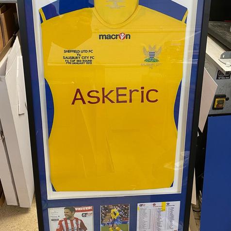 A fifth shirt framed for local footballer and current North Leigh FC Assistant Manager Michael Alexis, celebrating his appearance for Salisbury City FC against Sheffield United in the FA Cup 3rd round back in 2012, complete with programme and team sheet 👍.
