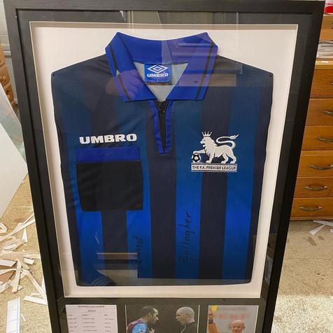A signed shirt by Premier League referee Dermot Gallagher, apparently one of the first coloured referee shirts to be used, framed for Kevin Rose. Thanks again Kevin 👍.