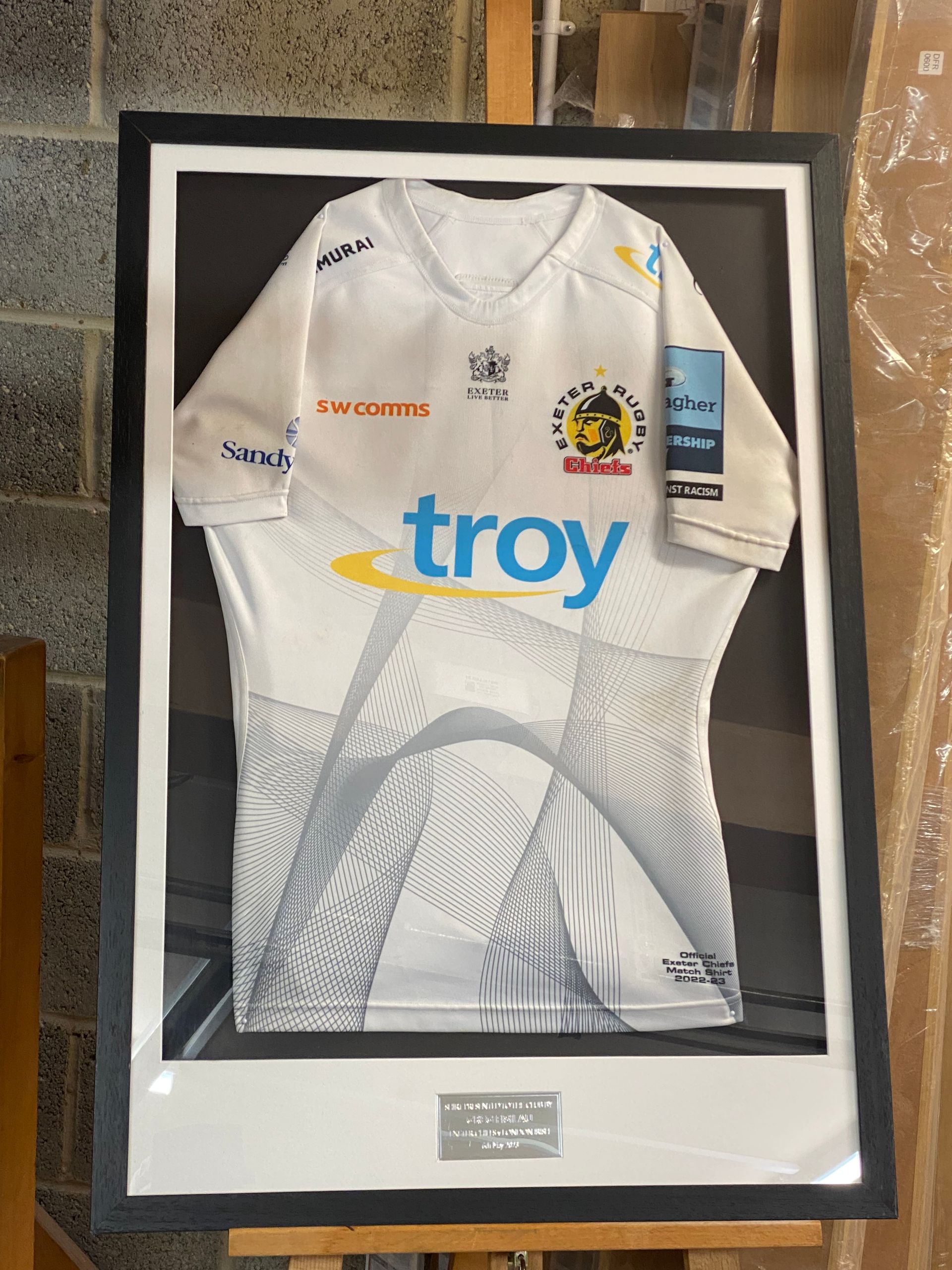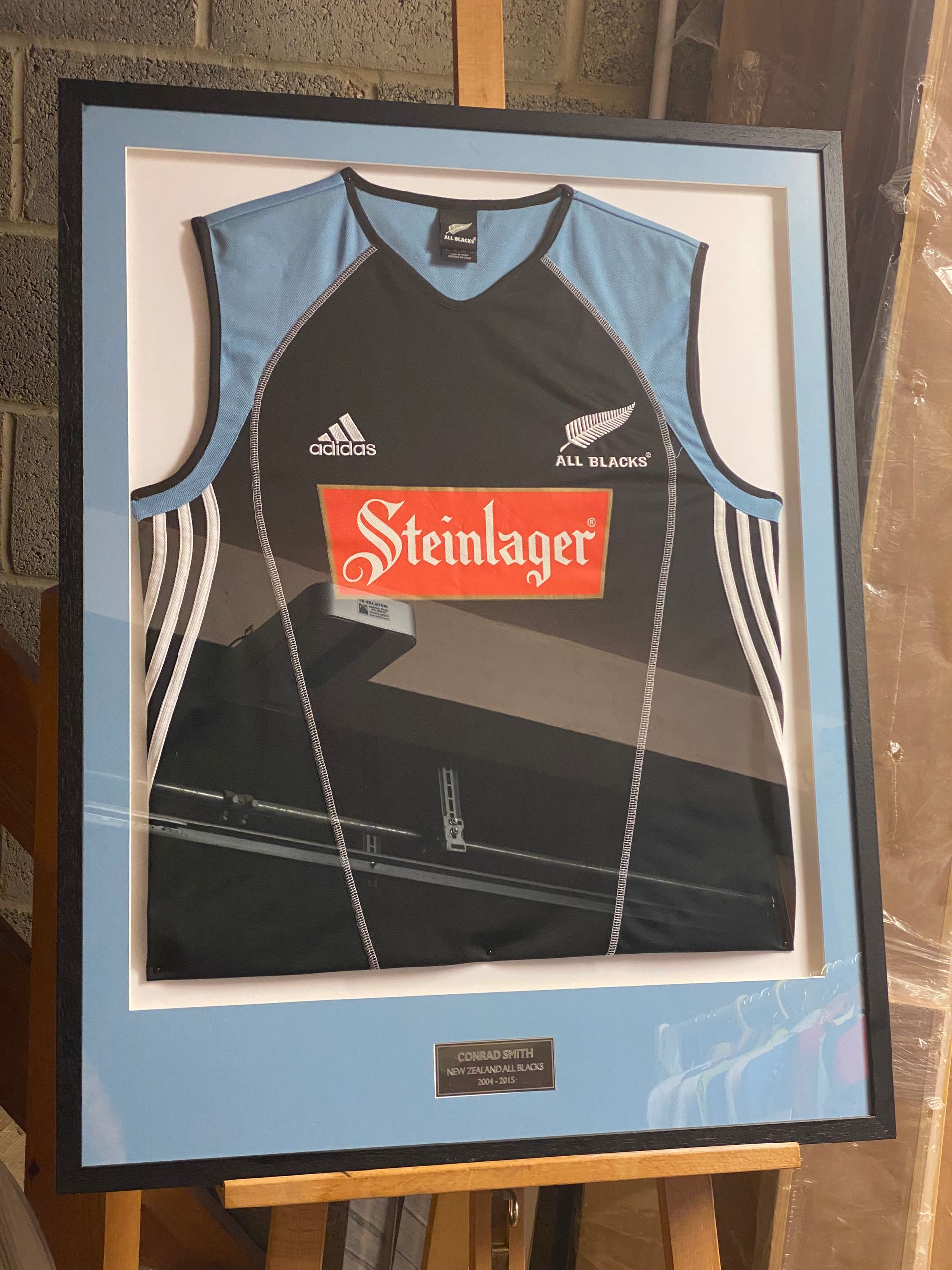 Rugby shirt, badges and photos framed for Iain Wakefield